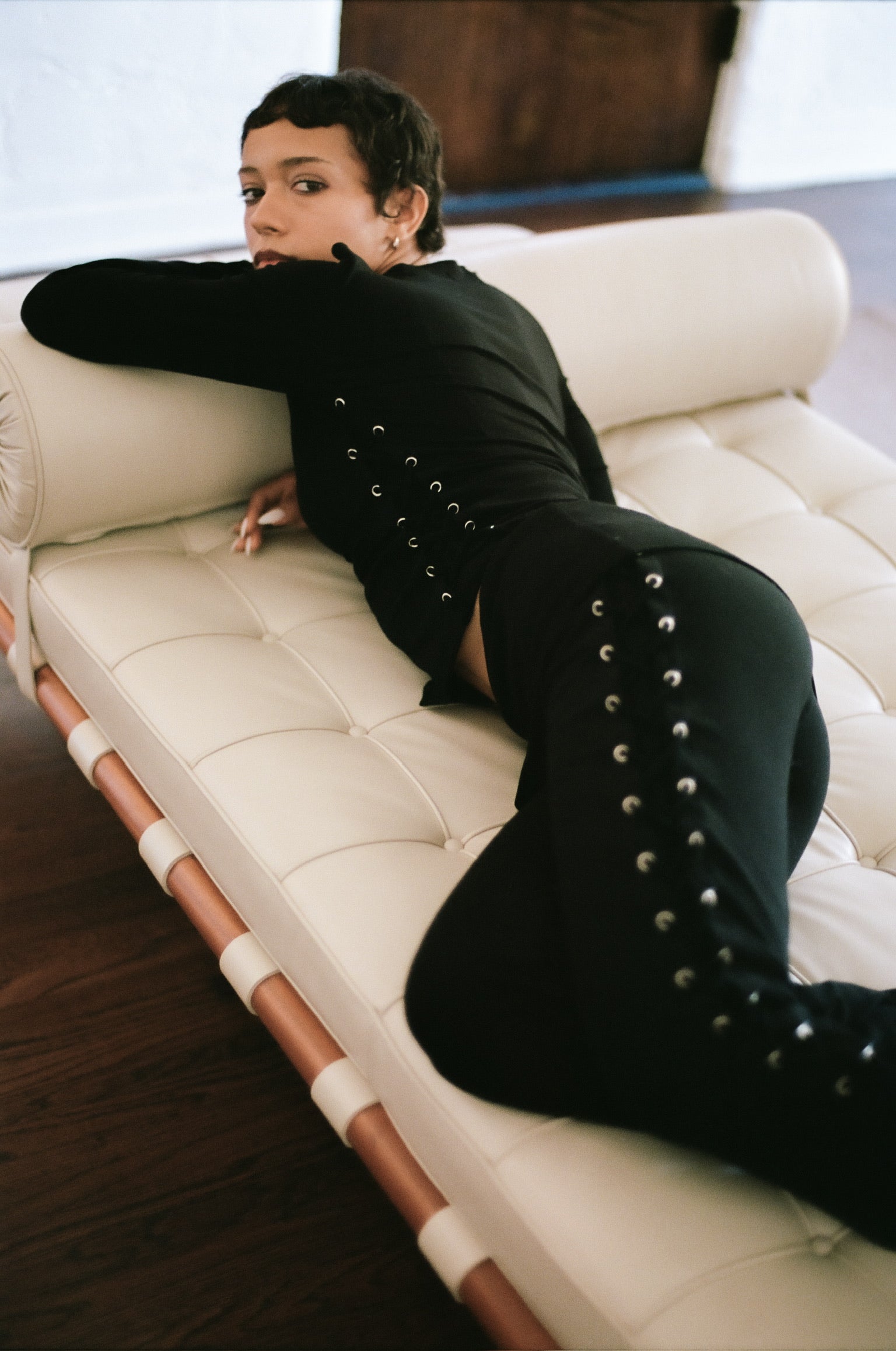 Designed for late nights that bleed into deep mornings. Featuring liquid-like sequin knits and lace up silhouettes to fade into as time slips softly away.